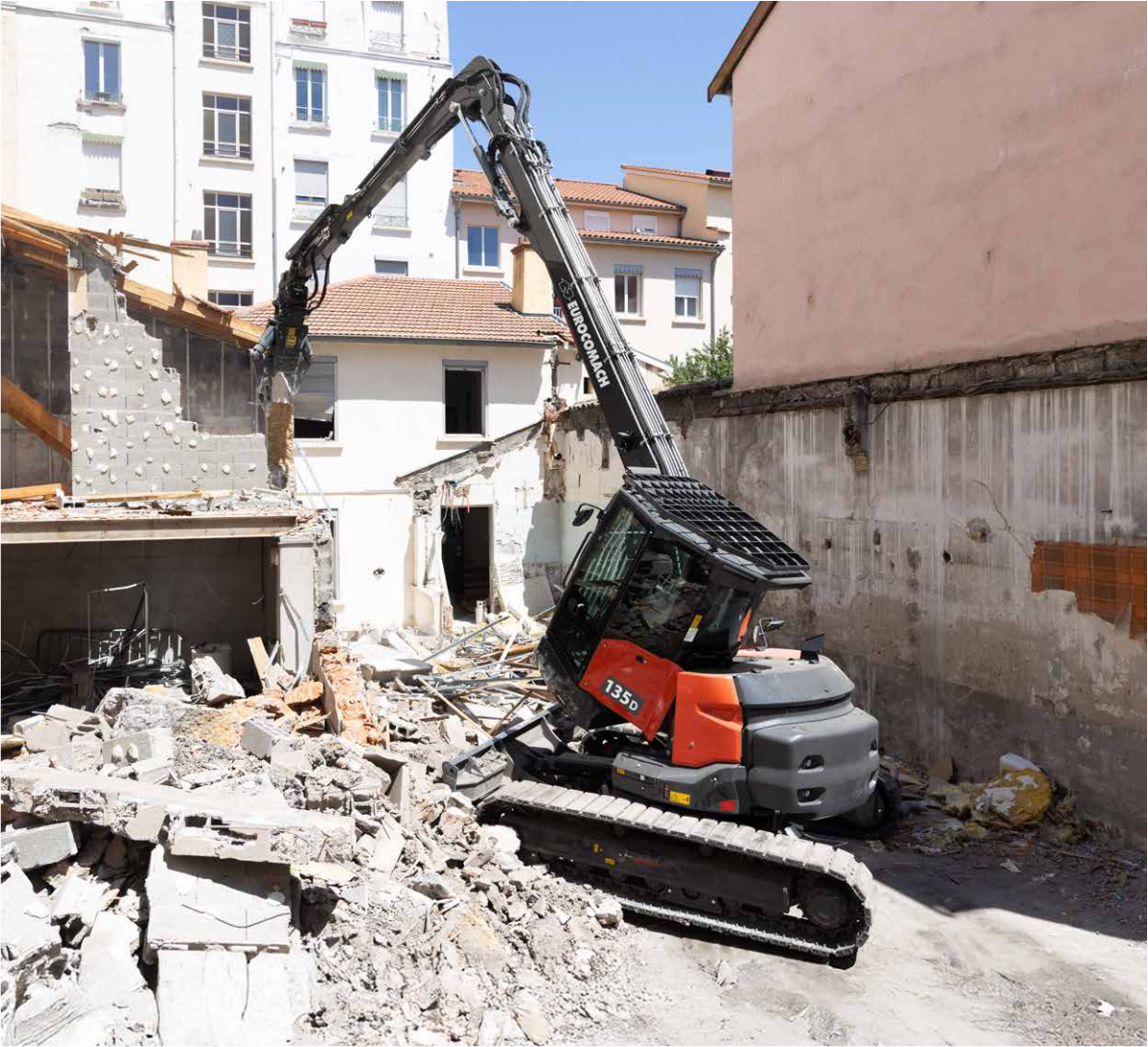Dank seines Gewichts (13,5 t), seines ausfahrbaren Unterwagens (Mindestbreite 2,32 m – max. 2,92 m) und seines Auslegers (13 m) kann der 135D in städtischen Gebieten arbeiten, die für traditionelle Abrissmaschinen unzugänglich sind.